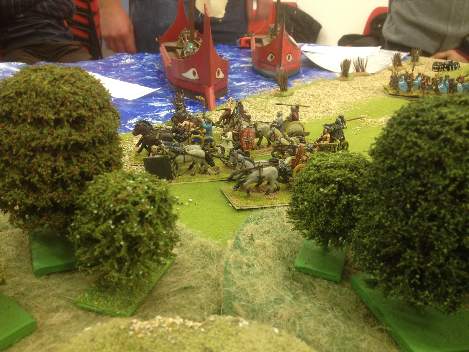 The beach was now firmly back in Roman control, when a band of chariots sped down a low hill onto the battle, they charged straight for the auxiliary slingers with no sign of stopping! The formed marines on the left had braced them selves for hails of javelins not a full blown charge at their support! The slingers fled before the thunderous charge!